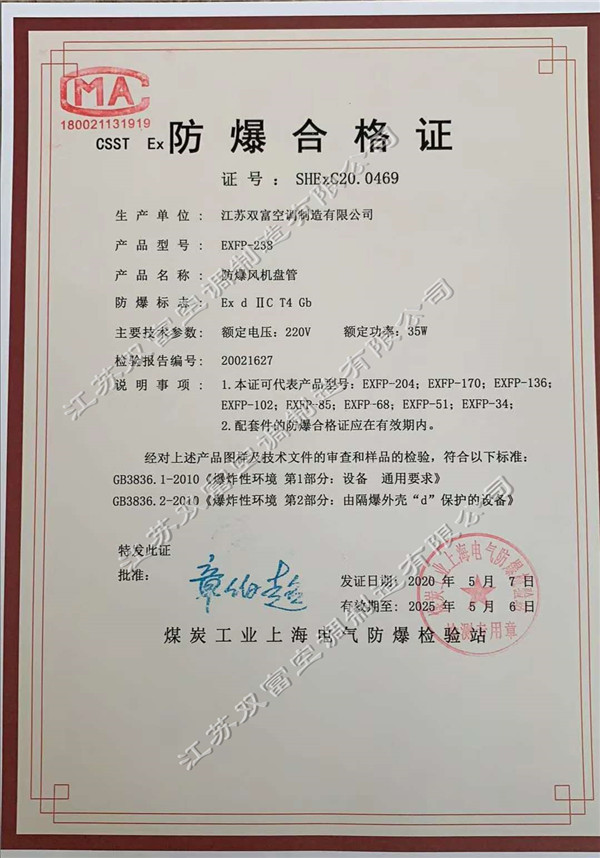 我公司已取得防爆風機盤管和防爆軸流風機的防爆合格證,主要用于防塵車間,煤礦,高鐵,配電房等要求比較高的場所。歡迎新老客戶咨詢。