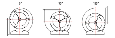 AKF系列外轉子風機制成整體結構,風機可分為左旋和右旋兩種,即從電機出線一側正視,葉輪逆時針旋轉稱為左旋,葉輪順時針旋轉稱為右旋。用戶訂貨時須注明風機旋向。AKF系列外轉子風機可制成0°、90°、180°三種常規角度(如下圖所示),也可按客戶要求制成任何安裝角度。